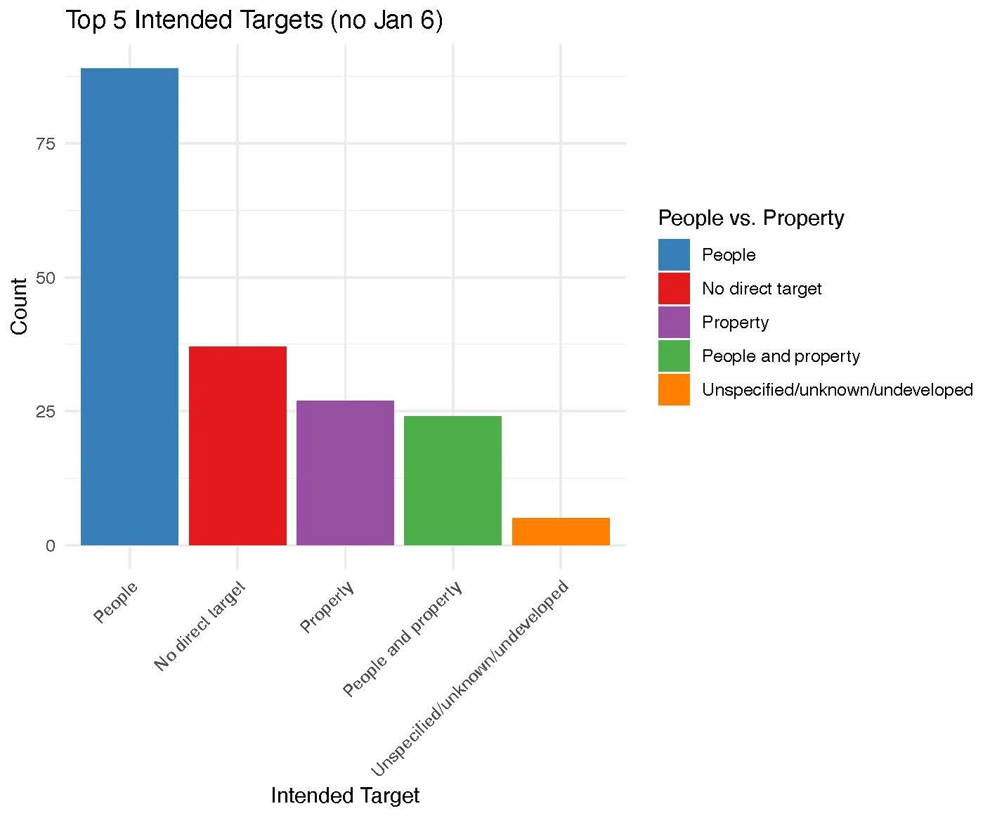 People are the primary intended targets of all non-January 6 cases (89 out of 186, or 48%), and all AED cases as a whole (90 out of 265 cases, or 34%), but Property was the dominant intended target on January 6, 2021, at the US Capitol (48 out of 79, or 61%).