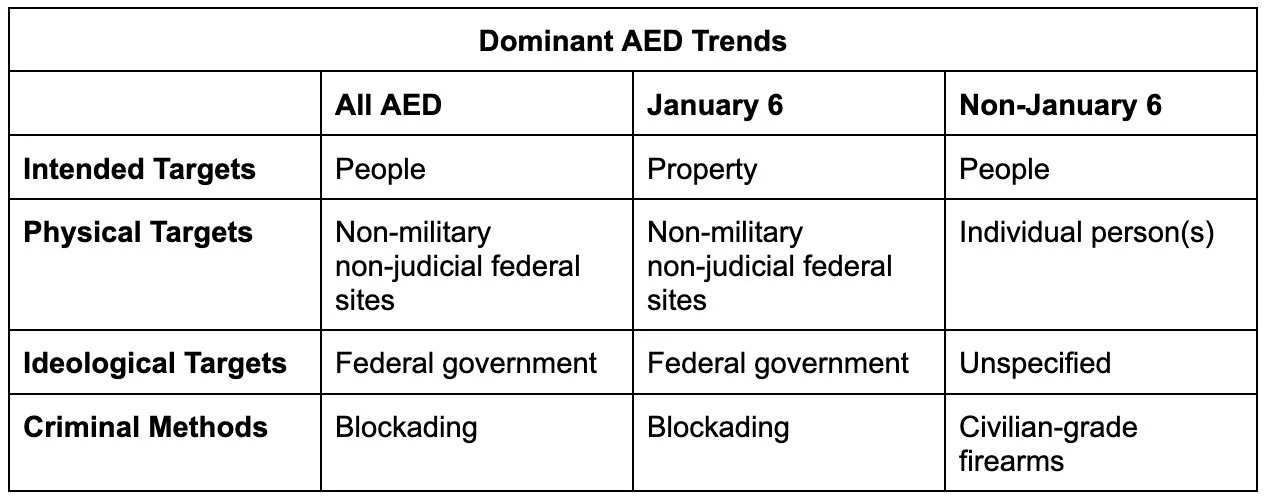 Ultimately, while January 6, 2021, was a historic outlier for many reasons, there were consistent trends across all accelerationist cases, namely: