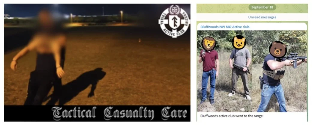 In several instances, Active Clubs in the US (who are supposed to only show street activism and sports publicly) have shared details on Telegram about militia-training activities, including shooting drills and tactical casualty care.